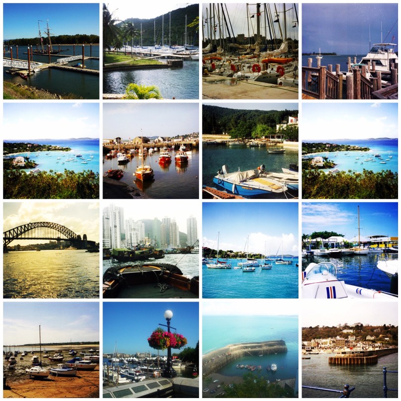1. Tall ship moored at the Marina, St Helens, Oregon, 2. Marina on St Lucia, 3. Marina on Rhodes, 4. Marina at the Hyatt Key West, Florida, 5. Caribbean View, 6. *West Bay, Dorset, 7. Agnontas, Skopelos, 8. Caribbean View, 9. Sydney Harbour Bridge, 10. Hong Kong Harbour, 11. Harbour on St John, 12. Harbour on Saint Martin, 13. *Gorey Harbour Jersey, 14. Victoria Harbour, Vancouver Island, BC Canada, 15. *View of Clovelly, Devon, 16. *Lyme Regis, Dorset