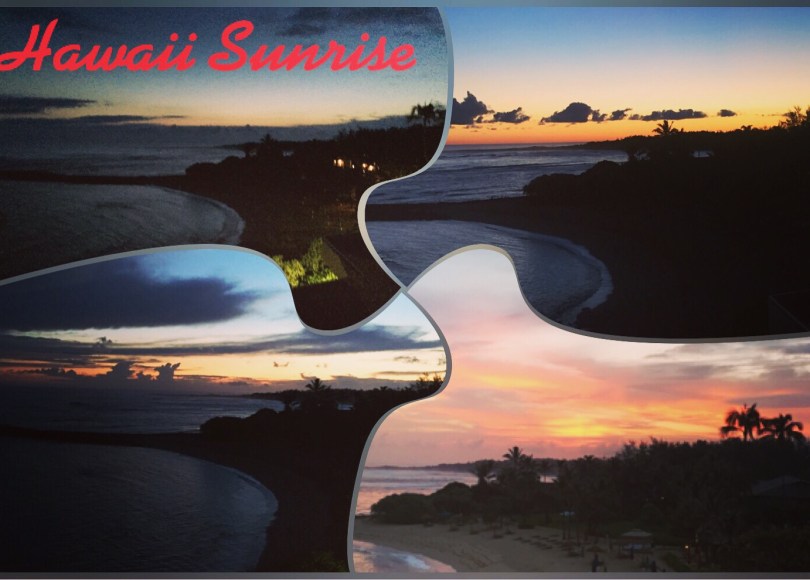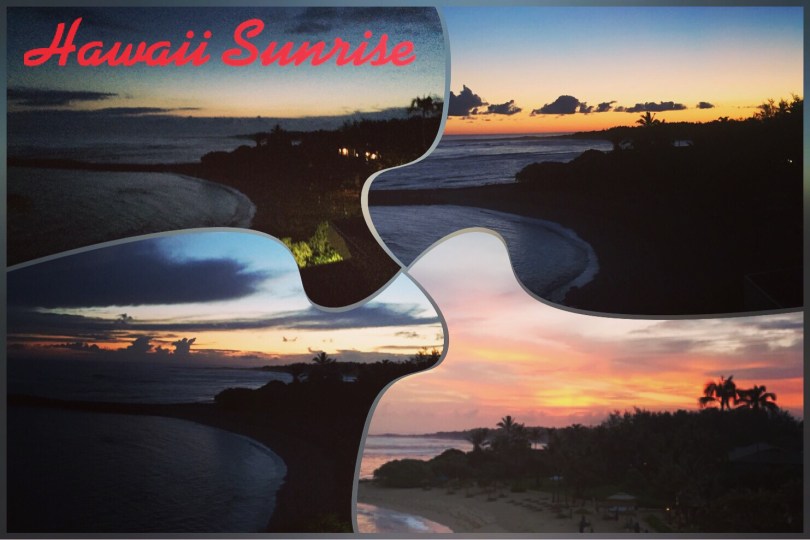 I thought today that I would make a postcard featuring four of the magnificent sunrises we saw in our recent trip to Hawaii. Every day was different and wonderful. So take a minute to enjoy these views…