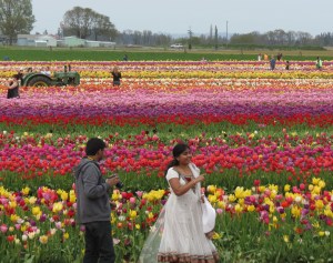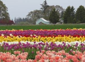 Tulip time in spring is a big deal here in the Pacific Northwest. We have tulip farms in Oregon and Washington. These four lovely, colorful photos were taken at the Wooden Shoe Tulip Festival a couple of years ago. The tulip farm, near Woodburn, is usually open for about six weeks so you can see the entire range of color. This year, up until now, it has been wet and muddy but a brighter few days is forecast. The tulips though, look as beautiful as ever. Two of the tulip farms in Washington are Woodland and the Skagit Valley. Highly recommended for an afternoon excursion.