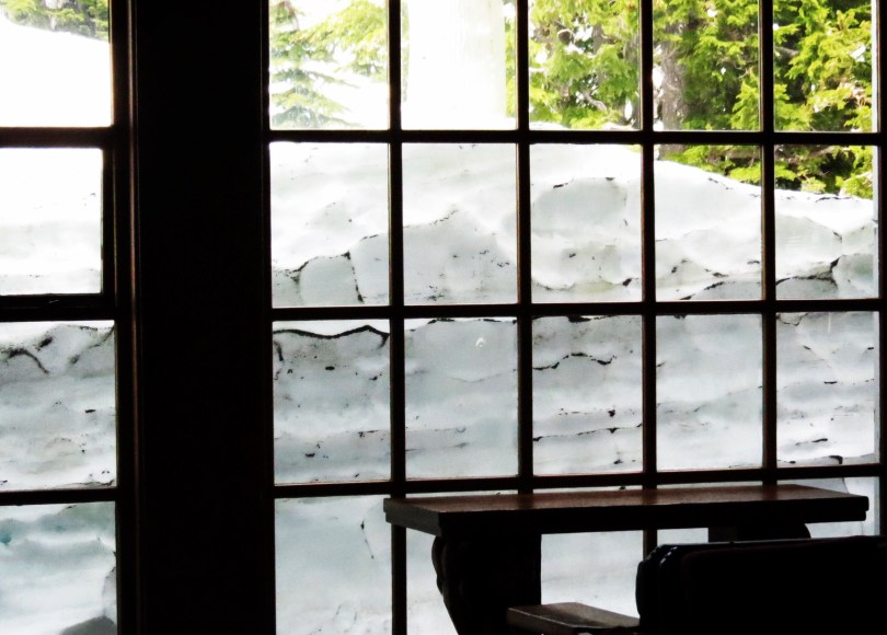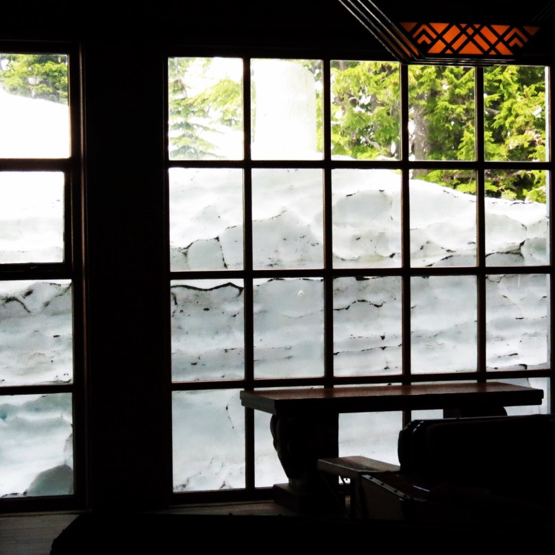 ๐ป๐ปThis is a cool photo – during the winter the snow piles up all around Timberline Lodge on Mount Hood in Oregon. It gets so high a snow tunnel is built to get in and out of the Lodge. Anyway spring comes and it starts to melt. Then you get these wonderful scenes of melting snow outside the windows. Timberline Lodge, sits and 6000 feet and was completed in the 1937 as part of the Works Progress Administration (WPA) instigated by President Roosevelt after the Great Depression. In the summer when the snow has gone beautiful flowers grow on the mountainside – but that is a post for another time. And Mount Hood (11245 feet) is a volcano – again, another post, another time.