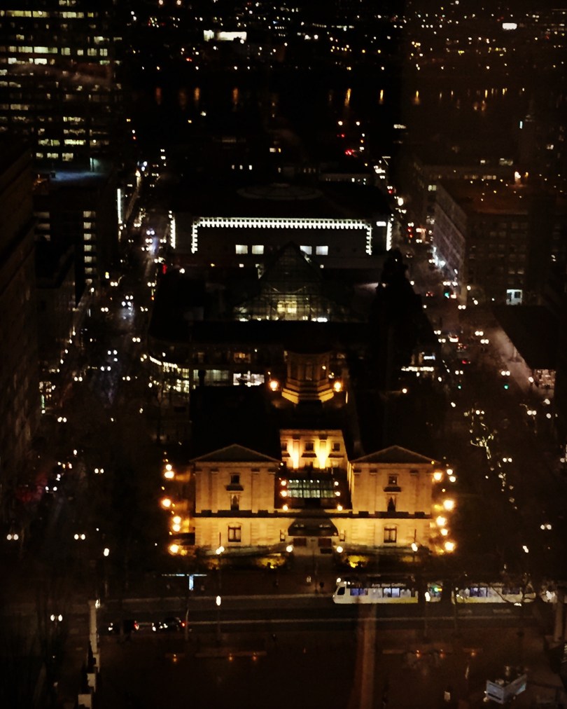 Portland, Oregon at night. This photo was taken from the 22nd floor of a downtown office building. The large building is the Pioneer Courthouse building which is situated next to Pioneer Courthouse Square, or as it locally referred to, Portland’s Living Room. The Square holds all kinds of events throughout the year including Portland’s Christmas tree in December and a giant flower mosaic for Rose Parade in June.