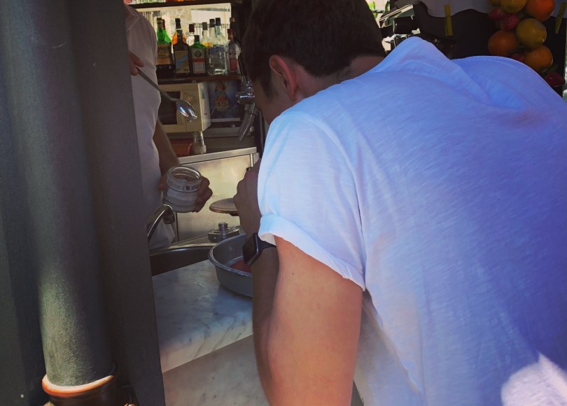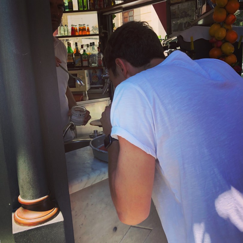 Photo 2 – Drinking Autista before it overflows…see yesterdayโs post for making Autista. Street food walking tour in Palermo, Sicily.