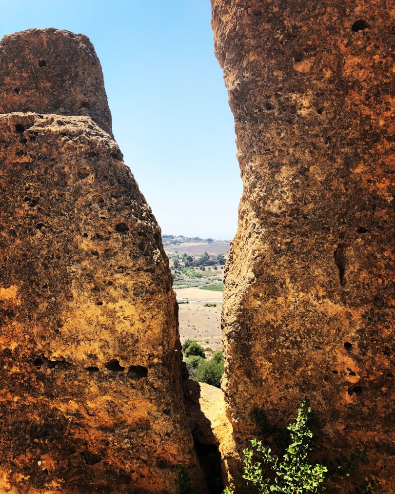 Here is another photo from Agrigento, the Valley of the Temples, Sicily. Taken through the old wall, you get the view if the plain below. The site is situated on a high hill. Interesting to wander around – but be advised there is little shade!