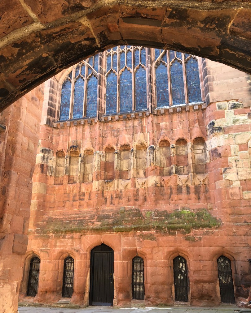 I have been trying to take different views around the old Coventry Cathedral. This is looking out from the opposite side (Bayley Lane) of the ruins rather than the new cathedral side. The lane takes you to the Guildhall. Note the distinctive red bricks and stained glass windows opposite.