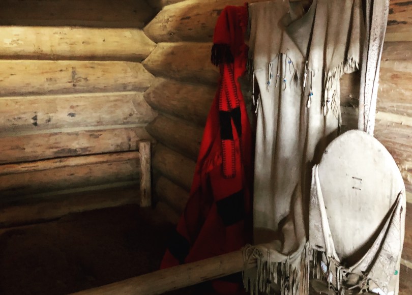 This is the cabin for Sacagawea, her baby Jean-Baptiste and her husband Toussaint Charbonneau at Fort Clatsop, near Astoria, Oregon. The original cabins were built for the winter 1805 camp of Lewis and Clark and their team. Note the Native American dress and the babyโs papoose on the wall. See my previous post for more on Lewis and Clark.
