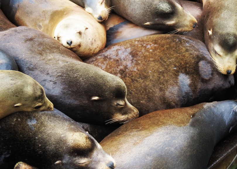 A heap of sleepy sealions today. This photo was taken at the Bayfront, Newport, Oregon where you can see several hundred noisy sealions lying on the boat pontoons. The Bayfront shopping, eating and several attractions including an aquarium and Ripleyโs Believe It or Not. A fun place to spend a few hours.