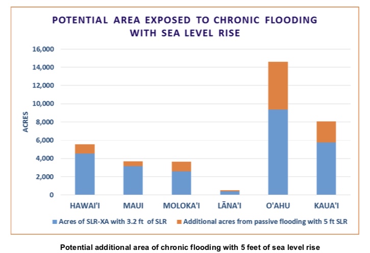 Figure 4. The number of acres of potential flooding due to a five-foot sea-level rise. (Source: www.climate.hawaii.gov, 2019)
