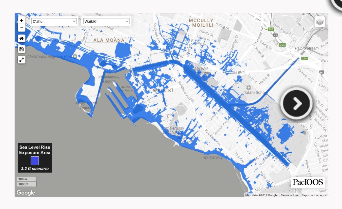 See the very interesting PacIOOS website for a Sea-level Rise Viewer showing the potential impact of sea-level rise on any of the Hawai’ian Islands.