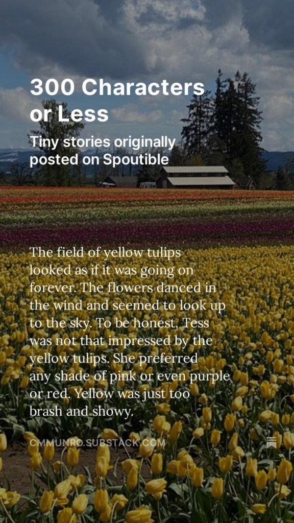 March 2, 2024 travel 300 Characters or Less Posted by BritTrip Tiny stories originally posted on Spoutible Carols Substack Wooden Shoe Tulips. Woodburn, Oregon Share this: Click to share on X (Opens in new window) X Click to share on Facebook (Opens in new window) Facebook Like Loading...