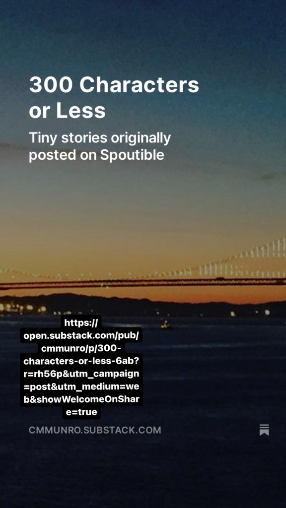 April 27, 2024 travel 300 Characters or Less Posted by BritTrip Tiny stories originally posted on Spoutible Golden Gate Bridge, San Francisco Carols Substack Share this: Click to share on X (Opens in new window) X Click to share on Facebook (Opens in new window) Facebook Like Loading...